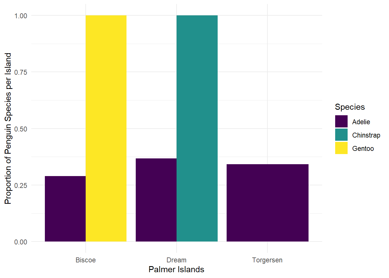 prop = n/total) #calculates the proportion on each island per species group # A tibble: 5 × 5