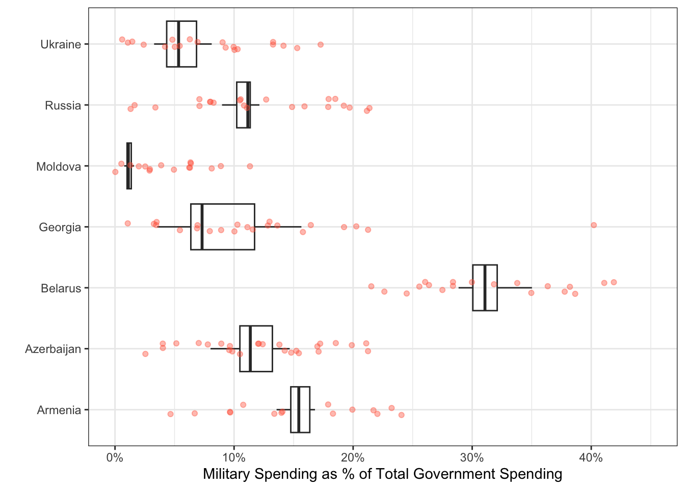 We are interested in comparing the military expenditures of countries in Eastern Europe. Our desired plot looks something like this: