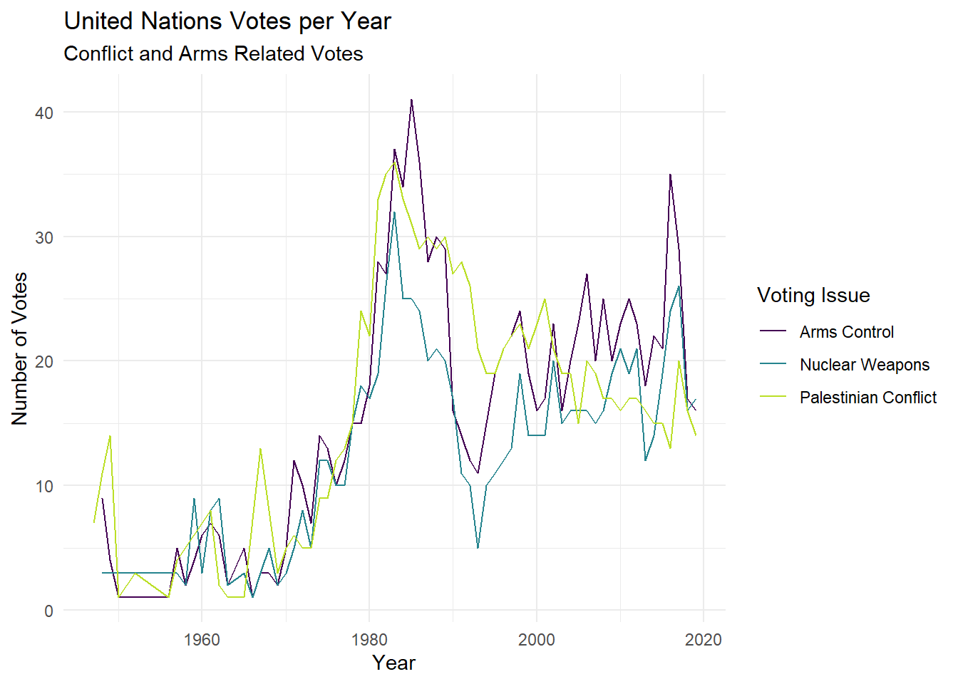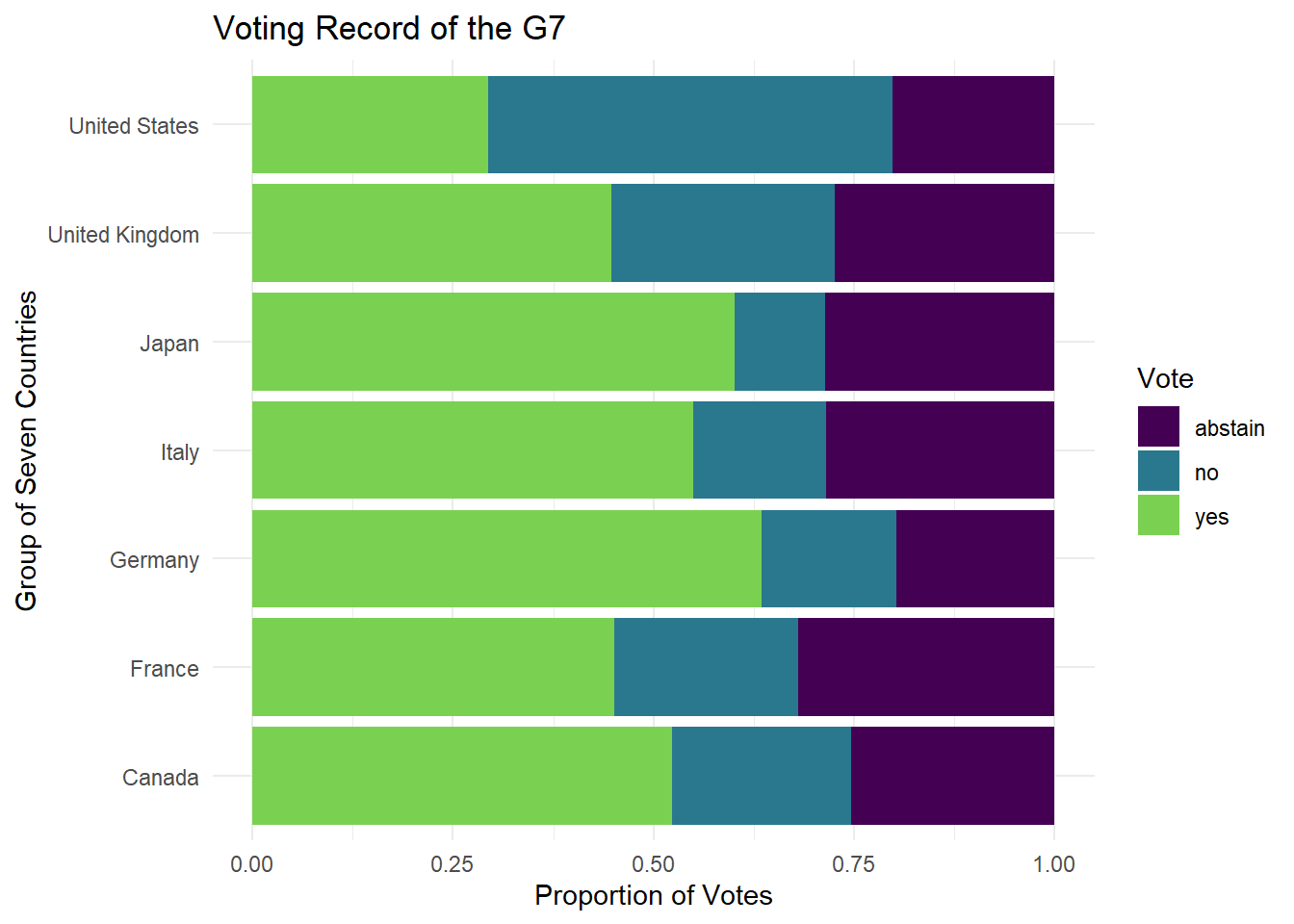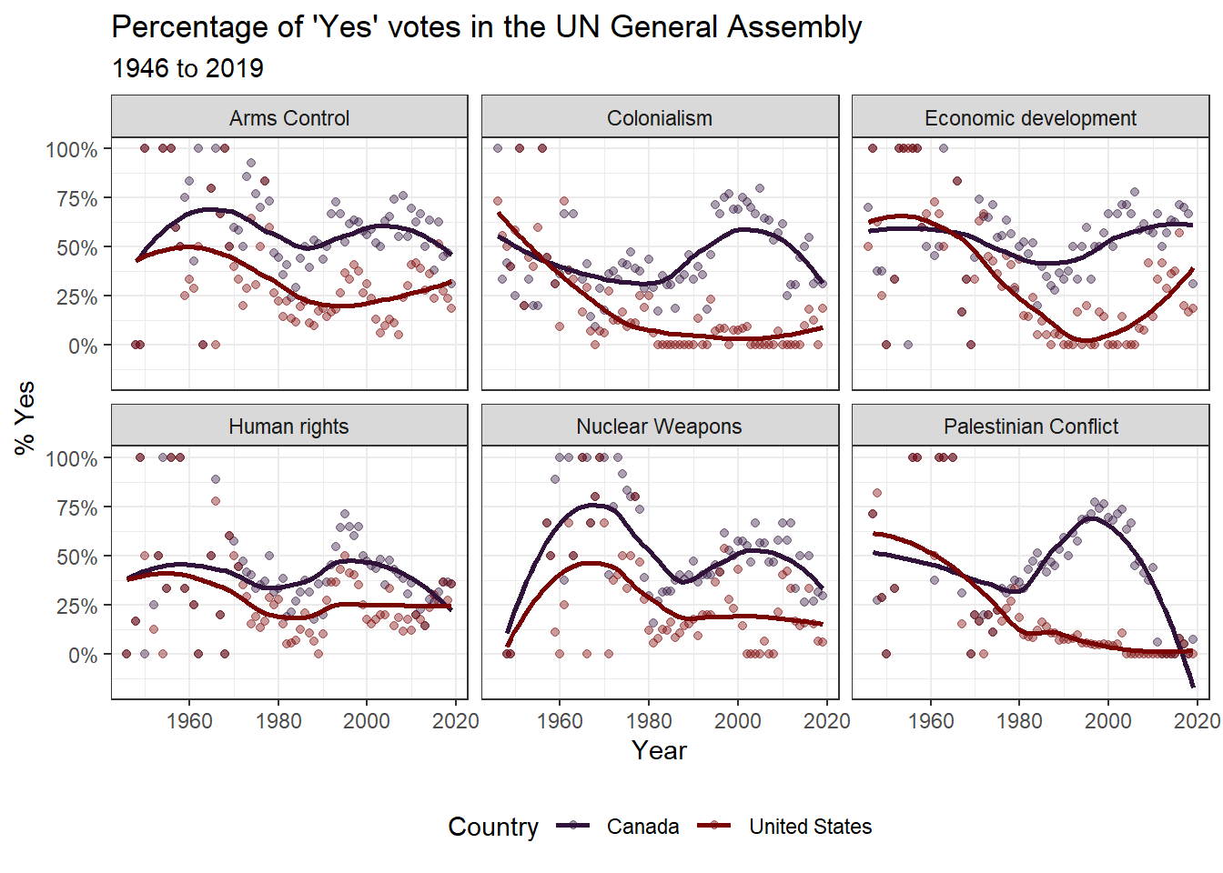 TRUE ~ issue)) # your comment hereNow we can feed the yes_votes transformed data table into your graphing code, but first we will want to focus on the United States and Canada. Provide a comment to describe what each line of code is doing in the process.