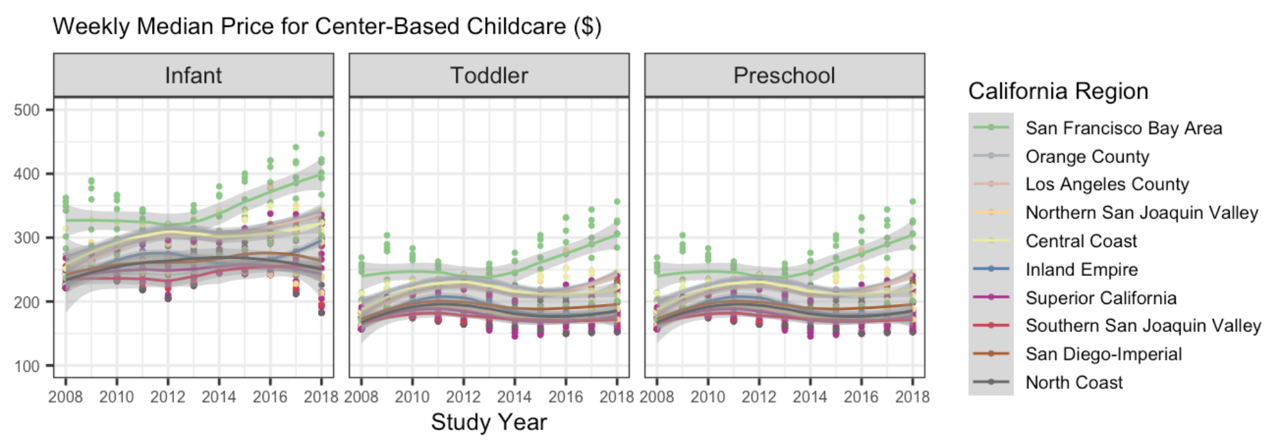 7. The following plot shows, for all ten regions, the change over time of the full-time median price for center-based childcare for infants, toddlers, and preschoolers. Recreate the plot. You do not have to replicate the exact colors or theme, but your plot should have the same content, including the order of the facets and legend, reader-friendly labels, axes breaks, and a loess smoother.